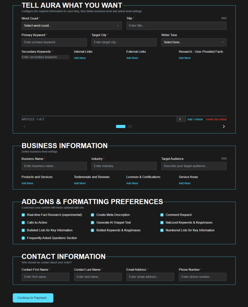 Once the content arrives, your team is free to make any revisions or adjustments. AURA is not currently offering revisions on articles. If you’re a high-volume client and need a tailored solution, we can design a custom content creator specifically for your needs. Book a call with us here to discuss how we can modify our software to meet your requirements.